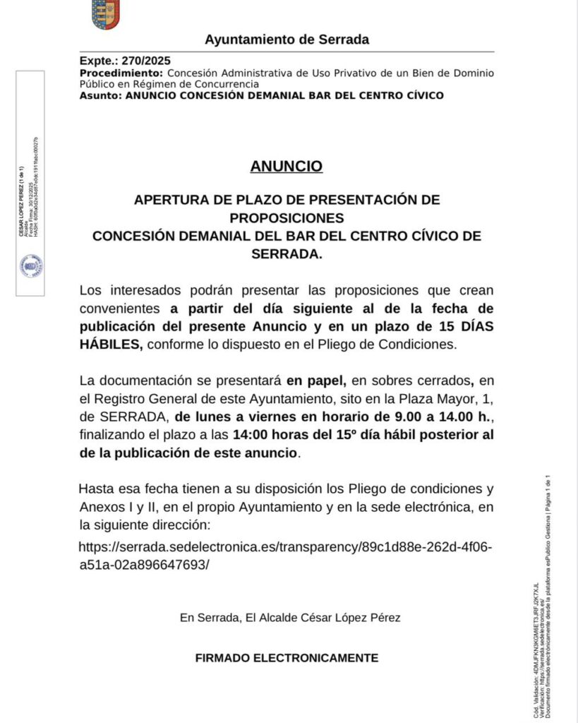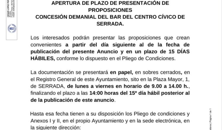 ANUNCIO APERTURA DE PLAZO DE PRESENTACI脫N DE PROPOSICIONES CONCESI脫N DEMANIAL DEL BAR DEL CENTRO C脥VICO DE SERRADA.