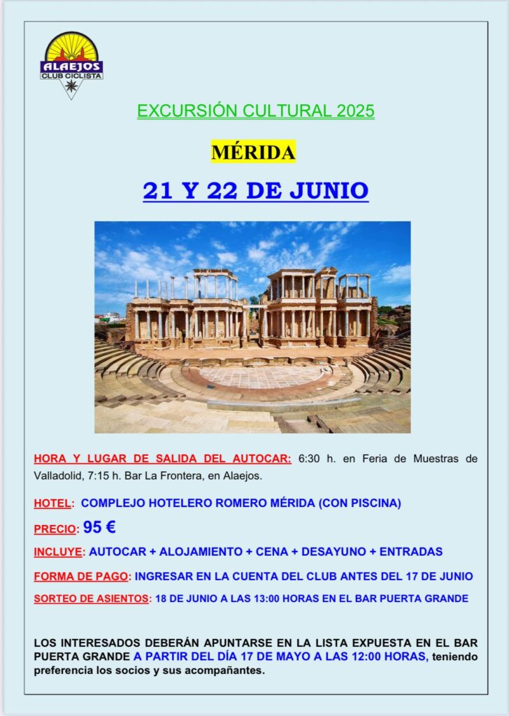 📢👉ALAEJOS: Excursión Cultural 2025 Club Ciclista de Alaejos: Mérida. 21 y 22 de Junio