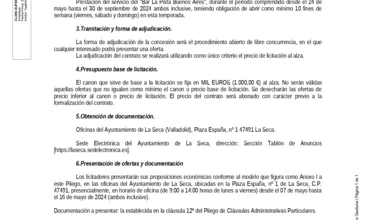 Objeto del contrato: Prestación del servicio del «Bar La Pista Buenos Aires», durante el periodo comprendido desde el 24 de mayo hasta el 30 de septiembre de 2024, ambos inclusive, teniendo obligación de abrir como mínimo 10 fines de semana (viernes, sábado y domingo) en esta temporada.