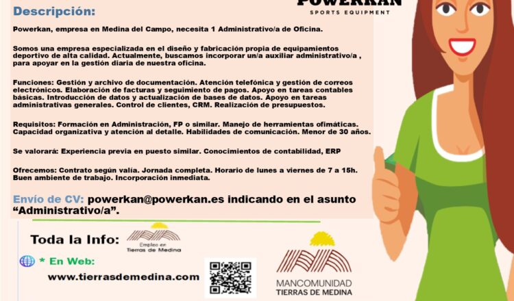 Powerkan, empresa en Medina del Campo, necesita 1 Administrativo/a de Oficina.