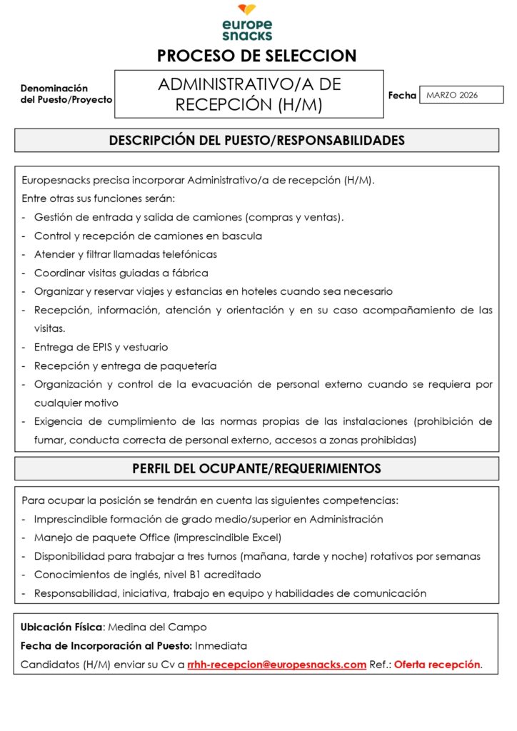 Candidatos (H/M) enviar su Cv a: rrhh-recepcion@europesnacks.com Ref.: Oferta recepción.