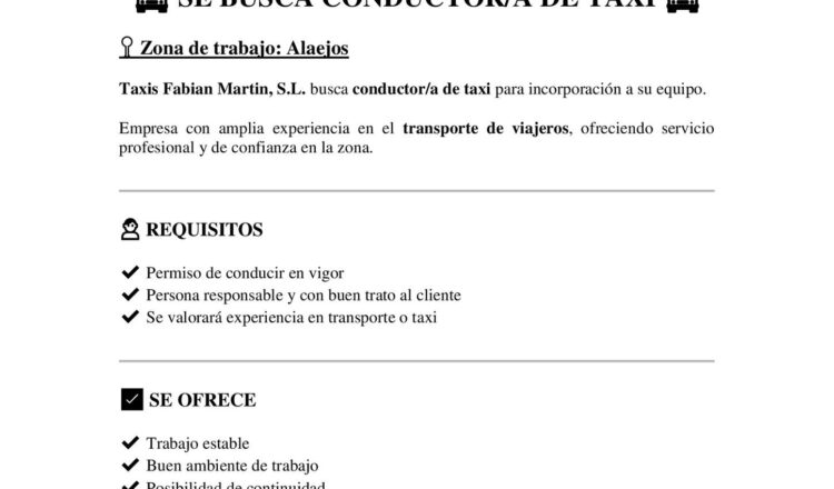 Taxis Fabián Martín, S.L., busca Conductor/a de Taxi para la zona de Alaejos.