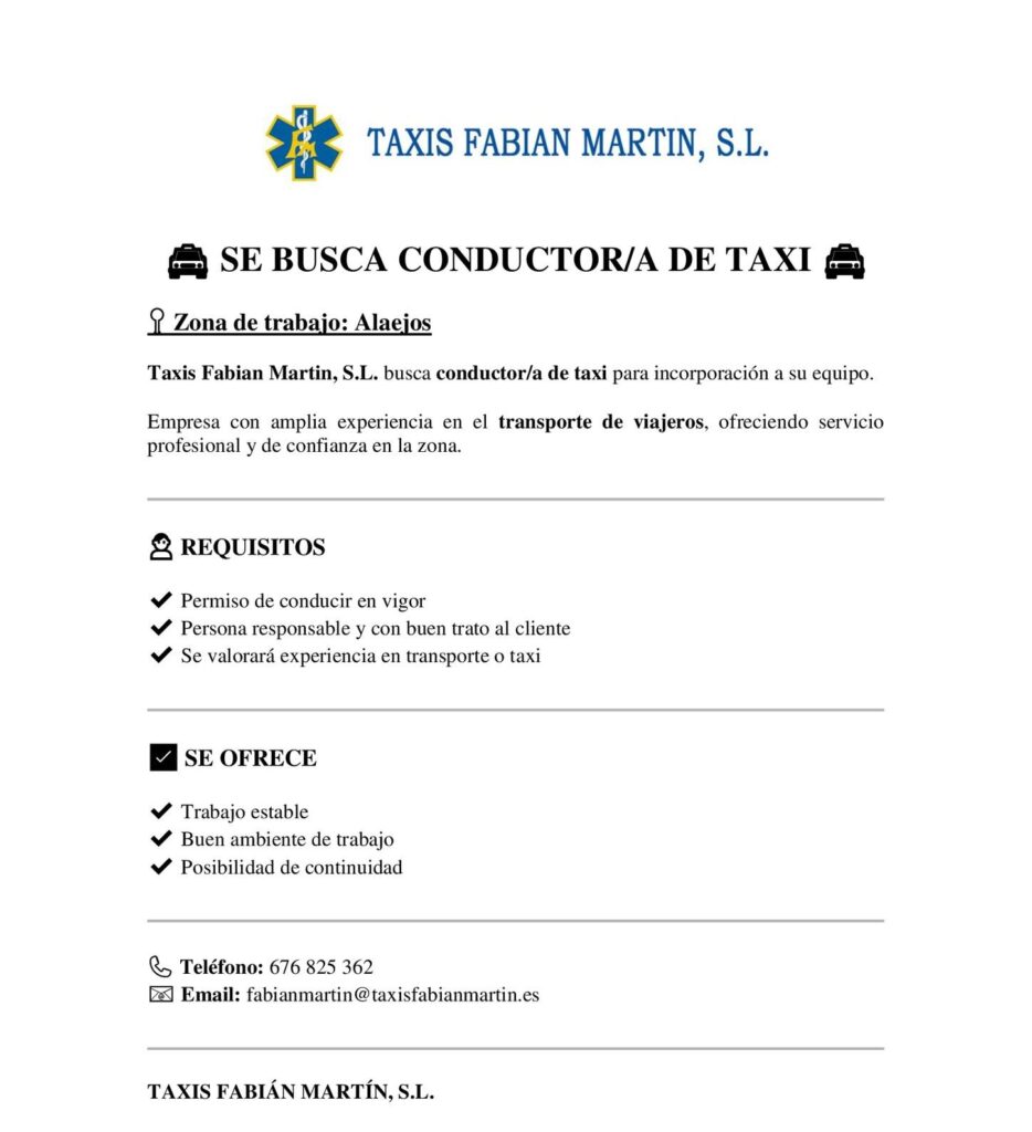 Taxis Fabian Martin, S.L. busca conductor/a de taxi para incorporación a su equipo.
