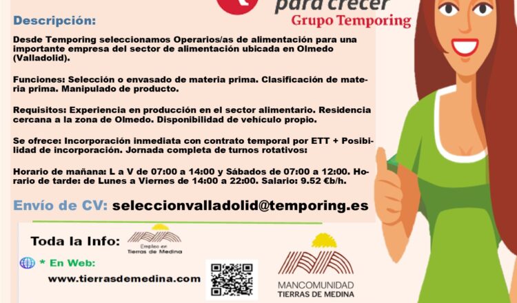 Desde Temporing seleccionamos Operarios/as de alimentación para una importante empresa del sector de alimentación ubicada en Olmedo (Valladolid).
