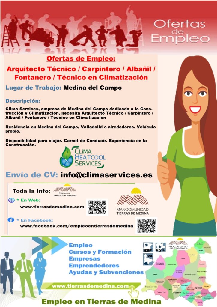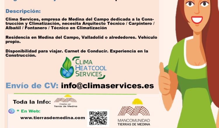 Clima Services, empresa de Medina del Campo dedicada a la Construcción y Climatización, necesita Arquitecto Técnico / Carpintero / Albañil / Fontanero / Técnico en Climatización